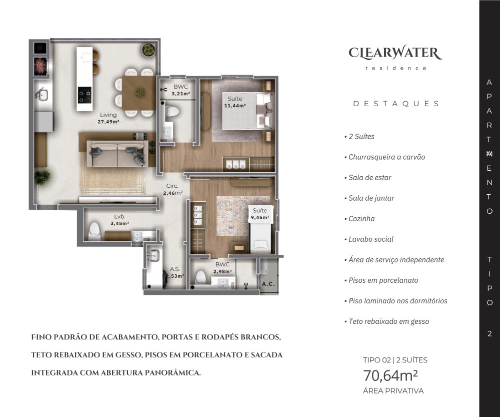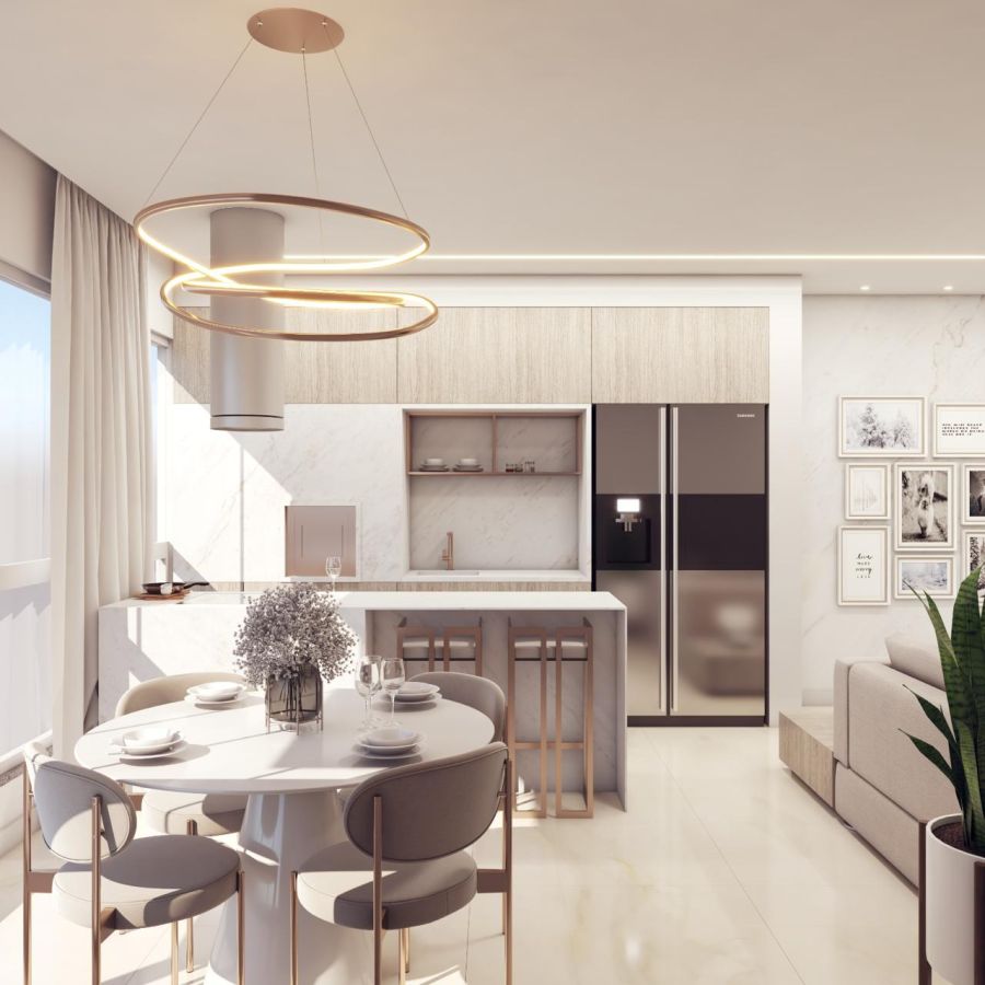 Além disso, a estrutura e distribuição dos cômodos traz luminosidade ao ambiente e fluidez para a circulação dos moradores. Todas as portas e rodapés são brancos, as duas suítes são amplas e a sacada é integrada com abertura panorâmica.